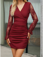 Party Dress Lace Dress New Year's Eve Dress Homecoming Dress Cocktail Dress Mini Dress Black Red Blue Long Sleeve Lace Fall Winter V Neck Winter Dress Wedding Guest