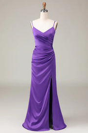 Purple thin shoulder strap V-neck tight slit satin bridesmaid dress