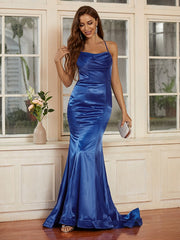 Sheath/Column Elastic Woven Satin Ruched Spaghetti Straps Sleeveless Sweep/Brush Train Dresses