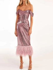 Sheath / Column Homecoming Dresses Sparkle & Shine Dress Party Wear Tea Length Sleeveless Off Shoulder Sequined with Feather Sequin Slit