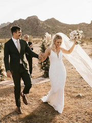 Sheath/Column Lace Applique Spaghetti Straps Sleeveless Sweep/Brush Train Wedding Dresses Beautiful