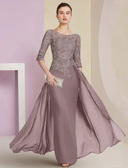 Sheath / Column Mother Bride Dress Formal Wedding Guest Elegant Scoop Neck Floor Length Chiffon Half Sleeve with Lace Appliques