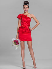 Sheath / Column One Shoulder Short / Mini Satin Bridesmaid Dress with Sash / Ribbon / Ruffles