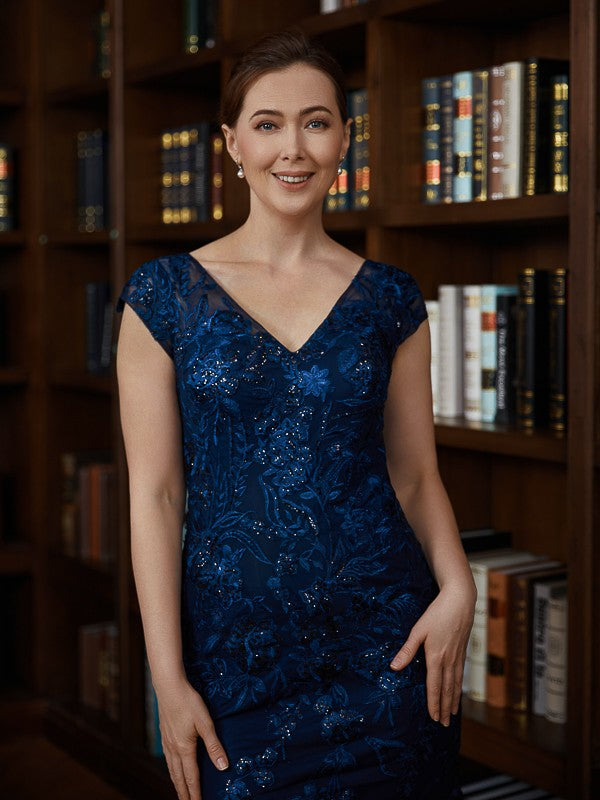 Sheath/Column Tulle Applique V-neck Short Sleeves Floor-Length Mother of the Bride Dresses - Dark Navy