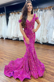 Sheath Mermaid Off-the-Shoulder Sweep/Brush Train Dresses Fuchsia Sleek Glitter Sparking Sequins Long Prom Dress - Fuchsia