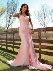Silk like Satin Ruched One-Shoulder Sleeveless Long Prom Dresses Pink