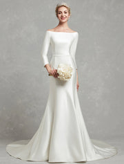 Simple Wedding Dresses Mermaid / Trumpet Off Shoulder 3/4 Length Sleeve Chapel Train Satin Bridal Gowns With Pleats Summer Wedding Party