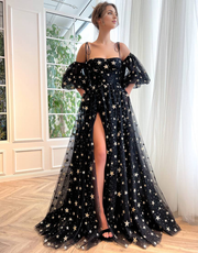 Spaghetti Straps Side Slit Black Long Prom Dress with Stars