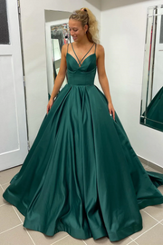 Sweep/Brush Train Dresses Hunter Green Deep V-Neck Straps A-line Long Prom Dress