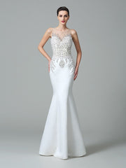 Trumpet/Mermaid Sheer Neck Applique Sleeveless Long Satin Dresses