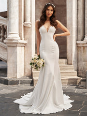 Trumpet/Mermaid Stretch Crepe V-neck Ruffles Sleeveless Chapel Train Wedding Dresses