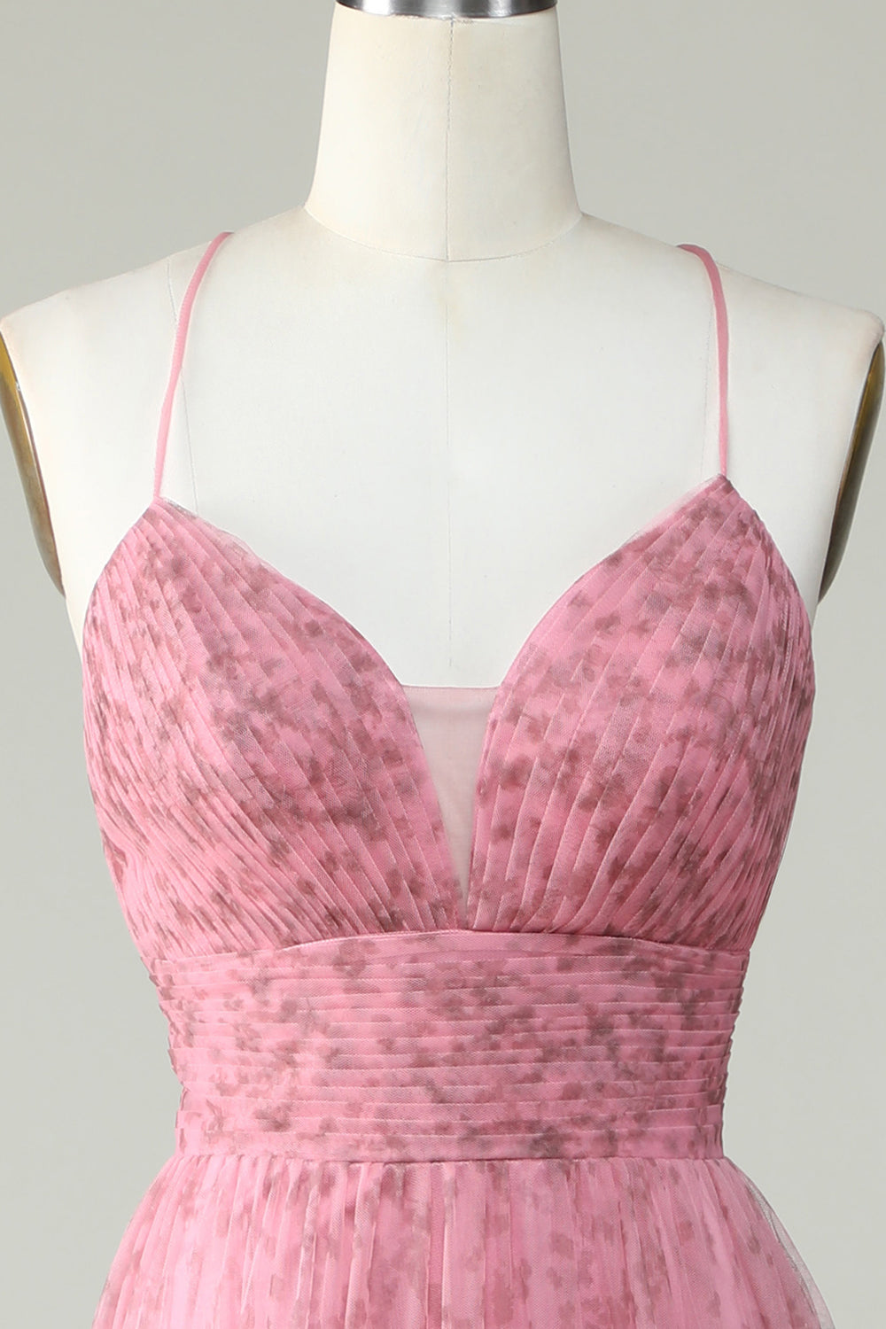 A Line Spaghetti Straps Layered Long Prom Dress With Floral Printed Floor Length