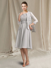 Two Piece A-Line Mother of the Bride Dress Church Elegant Jewel Neck Knee Length Chiffon Lace Sleeveless Wrap Included with Pleats Appliques