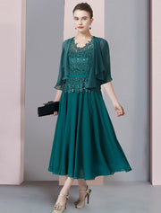 Two Piece A-Line Mother of the Bride Dress Formal Wedding Guest Elegant V Neck Tea Length Chiffon Lace Short Sleeve Wrap Included with Sequin Appliques