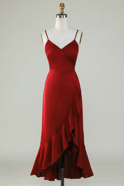 V Neck Spaghetti Straps Burgundy Bridesmaid Dress with Ruffles