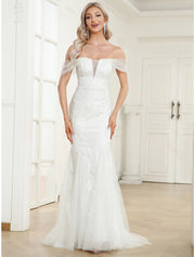 Wedding Dresses Mermaid / Trumpet Off Shoulder Cap Sleeve Sweep / Brush Train Lace Bridal Gowns With Appliques - As Picture / US 2 / UK 6 / EU 32