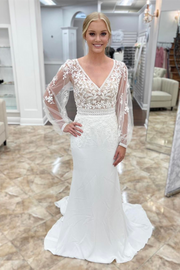 White Mermaid Deep V Neck Illusion Sleeves Appliques Long Wedding Dress Beautiful - As picture / US 2 / UK 6 / EU 32
