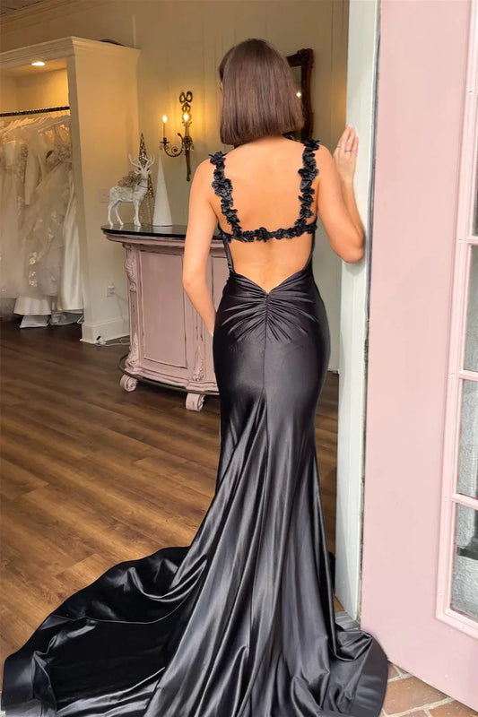 Black Floral Straps Mermaid Long Prom Dress with Slit Sexy Evening Dress