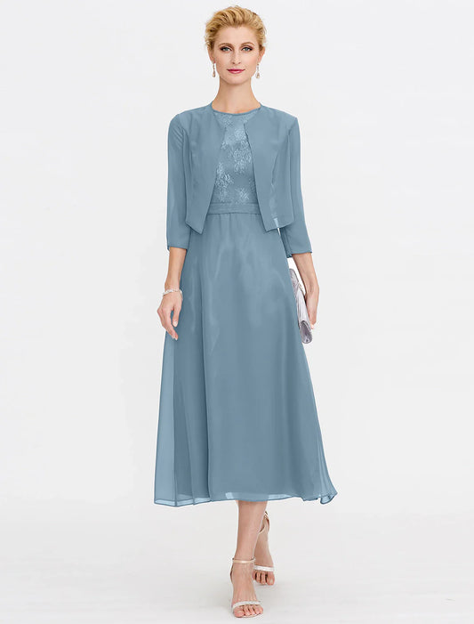 A-Line Mother of the Bride Dress Fall Wedding Guest Dresses Plus Size Elegant Illusion Neck Tea Length Chiffon Corded Lace Sleeveless Wrap Included with Lace Pleats