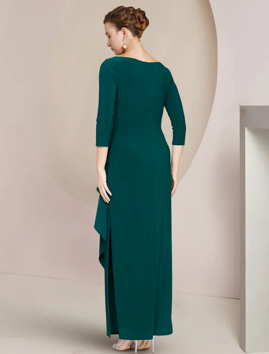 Sheath / Column Mother of the Bride Dress Wedding Guest Elegant Scoop Neck Ankle Length Stretch Chiffon 3/4 Length Sleeve with Crystals Ruffles Split Left