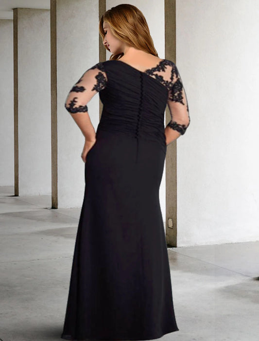 A-Line Plus Size Curve Mother of the Bride Dresses Elegant Dress Formal Wedding Guest Floor Length Half Sleeve Jewel Neck Chiffon with Pleats Ruched Appliques