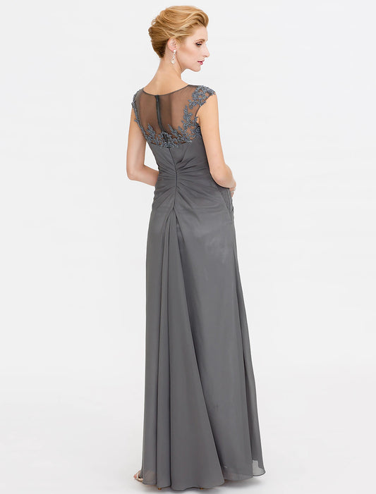 A-Line Mother of the Bride Dress Wedding Guest Elegant See Through Bateau Neck Floor Length Chiffon Lace Sleeveless with Side Draping Fall