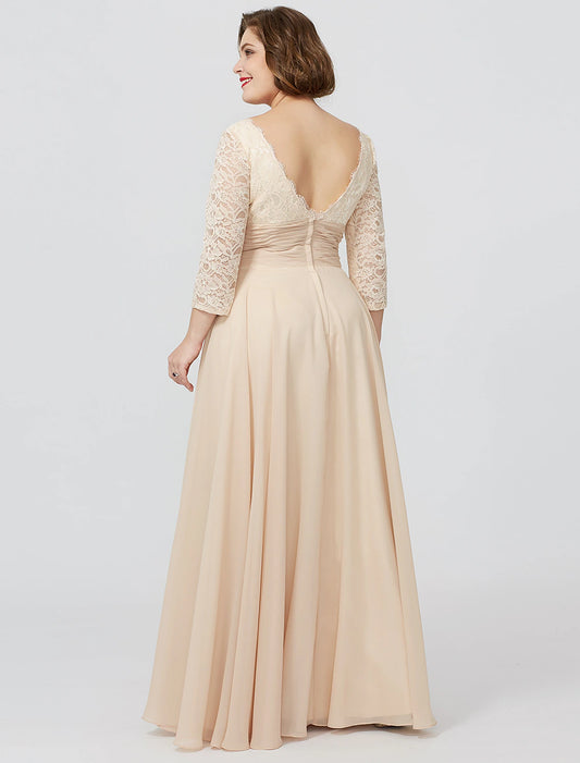 A-Line Mother of the Bride Dress Elegant V Neck Floor Length Chiffon Lace 3/4 Length Sleeve with Ruffles Appliques