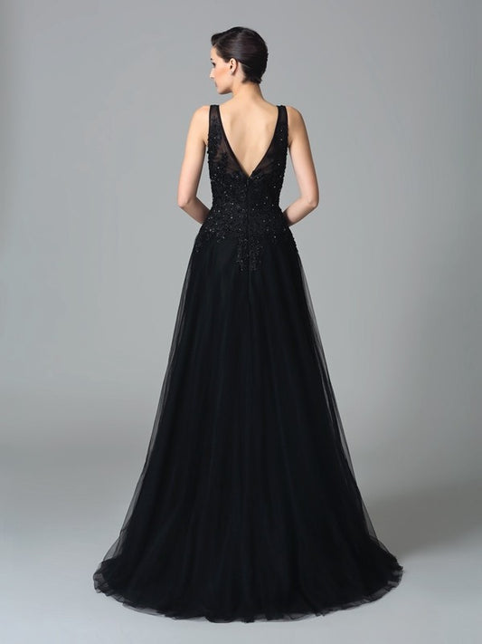 A-Line/Princess Straps Beading Sleeveless Long Net Mother of the Bride Dresses