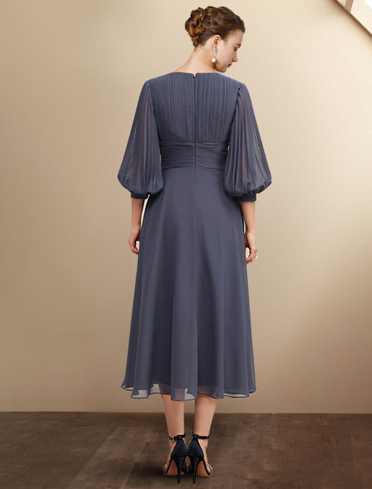 A-Line Mother of the Bride Dress Wedding Guest Elegant Petite V Neck Tea Length Chiffon 3/4 Length Sleeve with Ruching Solid Color