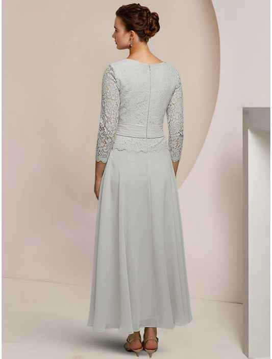 A-Line Mother of the Bride Dress Wedding Guest Elegant Jewel Neck Ankle Length Chiffon Long Sleeve with Lace Pleats Appliques