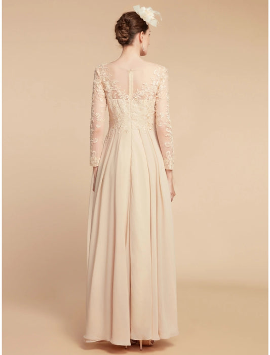 Sheath / Column Mother of the Bride Dress Formal Wedding Guest Elegant Scoop Neck Floor Length Chiffon Lace Long Sleeve with Sequin Appliques