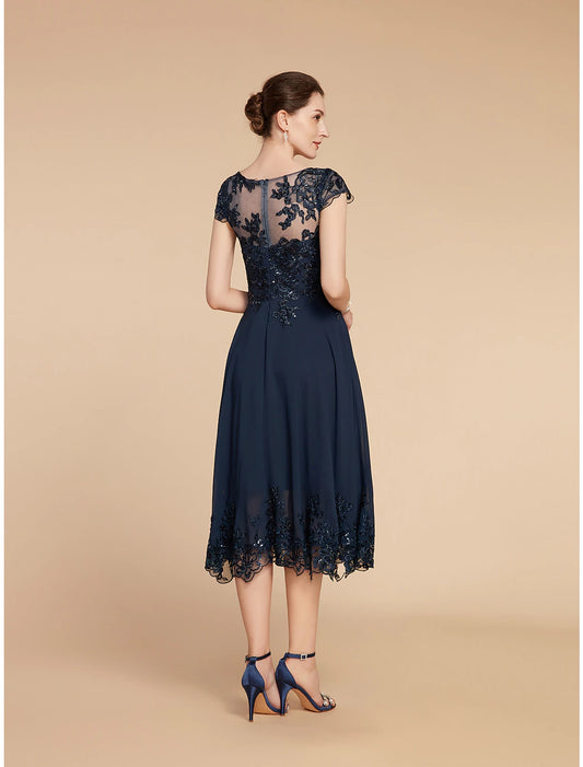 A-Line Mother of the Bride Dress Formal Wedding Guest Vintage Elegant Scoop Neck Tea Length Lace 3/4 Length Sleeve with Sequin Appliques Fall