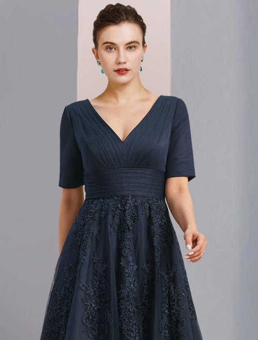 A-Line Mother of the Bride Dress Formal Wedding Guest Elegant Vintage V Neck Ankle Length Chiffon Lace Short Sleeve with Pleats Ruched Appliques