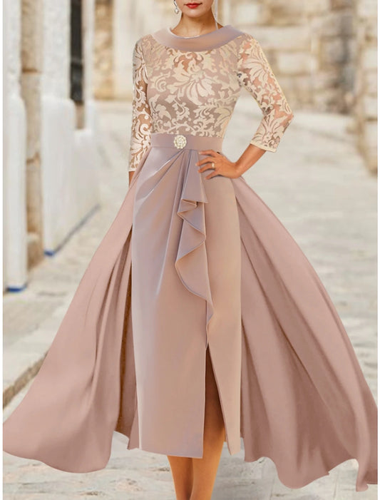 A-Line Mother of the Bride Dress Formal Wedding Guest Party Elegant Scoop Neck Tea Length Satin Lace 3/4 Length Sleeve with Sash / Ribbon Pleats