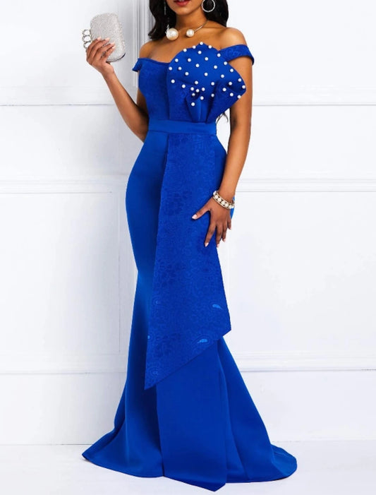 Sheath Mermaid Off the Shoulder Party Dress Short Sleeve Brush Train Dress with Sash / Ribbon Pearls