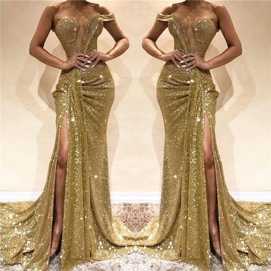 Sheath Mermaid Sweep/Brush Train Dresses Deep V-Neck Court Train Prom Party Dress With Sequins