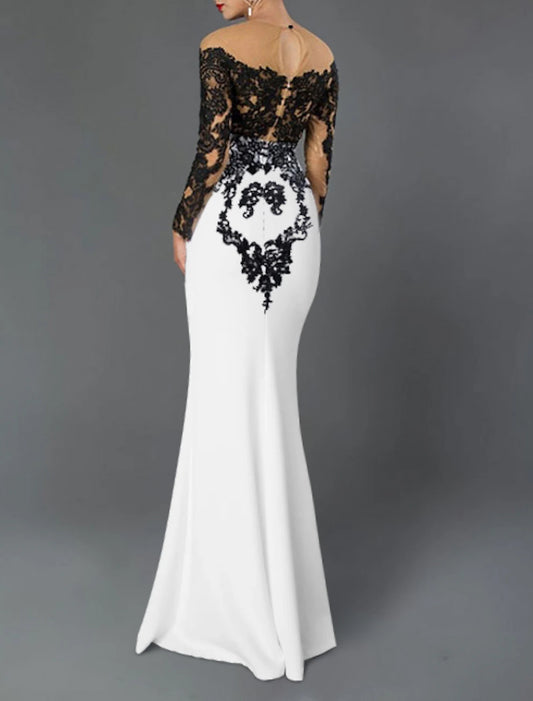 Sheath Mermaid Long Sleeve Evening Gown Off the Shoulder Jewel Neck Stretch Crepe Prom Dress with Appliques