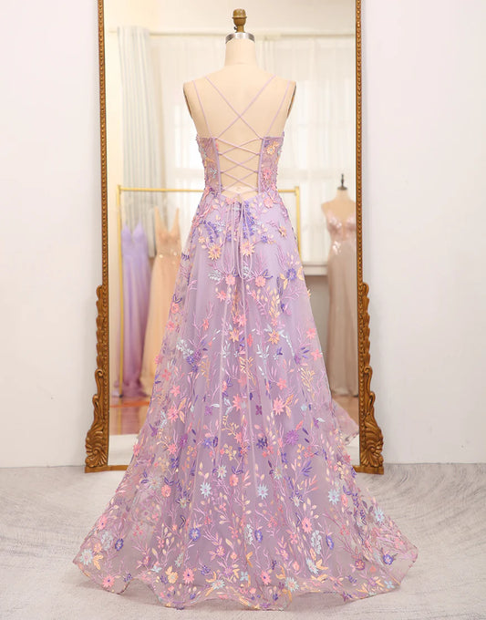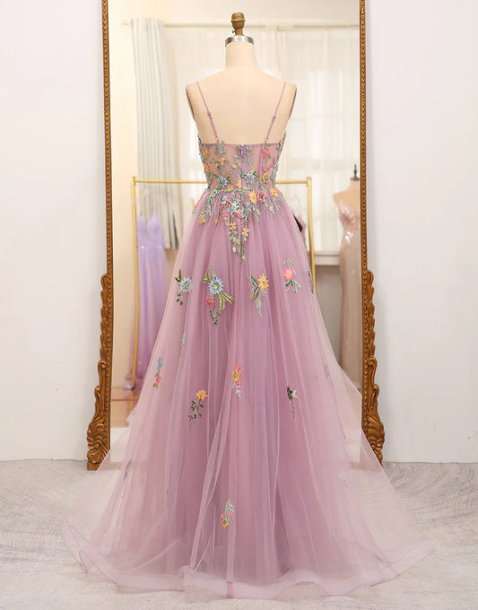 A Line Slit Spaghetti Straps Long Prom Dress With Appliques