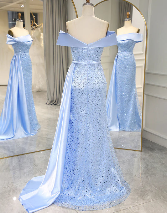 Mermaid Sleek Glittering Sparkle Sequins Grey Blue Long Prom Dress with Silt