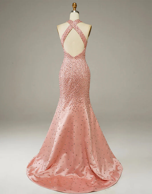 Sheath Halter Satin Long Sleeveless Prom Dresses With Rhinestones