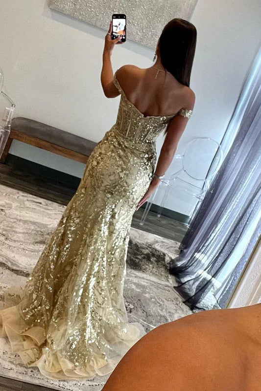 Mermaid Sweetheart Gold Sequins Long Prom Dresses with Slit