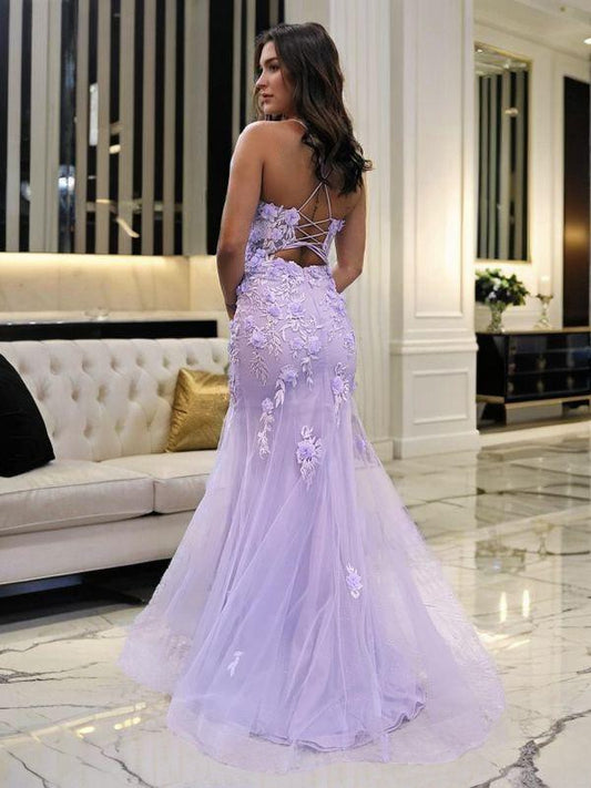 Sheath/Column Tulle Applique Spaghetti Straps Sleeveless Sweep/Brush Train Corset Dresses