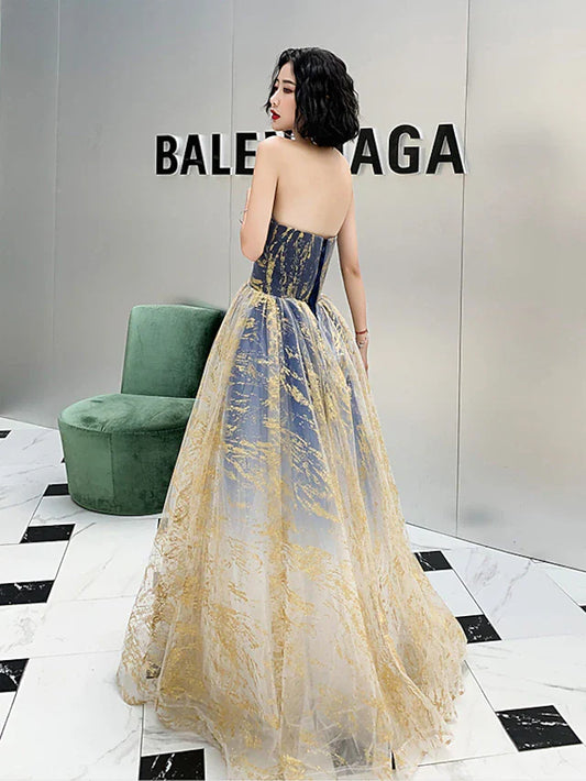 A-Line Color Block Sparkle Engagement Prom Dress Strapless Sleeveless Floor Length Sequined with Sequin