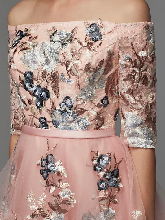 A-Line Prom Dresses Floral Dress Evening Party Asymmetrical Half Sleeve Off Shoulder Satin with Embroidery Appliques