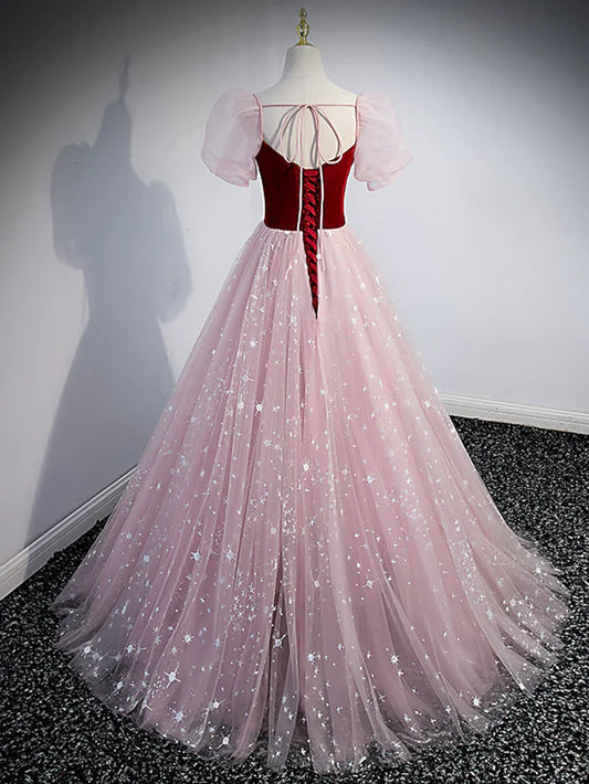 A-Line Prom Dresses Princess Dress Prom Floor Length Short Sleeve Sweetheart Tulle with Sequin