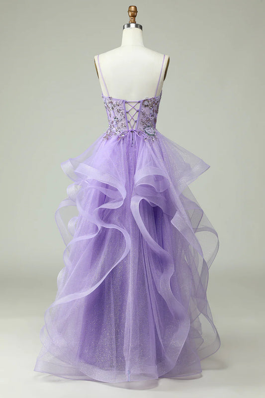 A Line V Neck Spaghetti Straps Tulle Layers Long Prom Dress with Appliques Beautiful