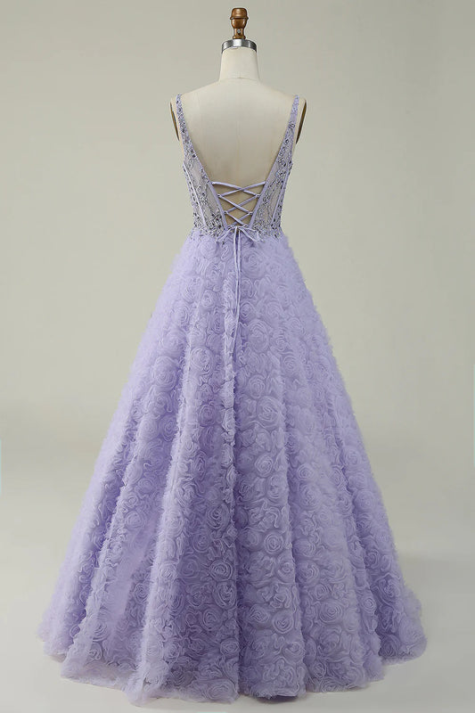 A Line V Neck Long Prom Dress with 3D Flowers Beautiful