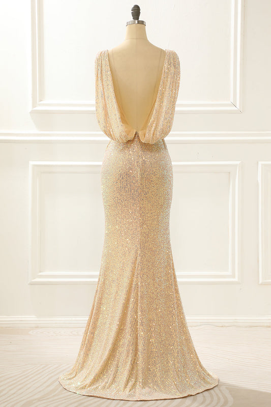 Champagne Mermaid Sequin Prom Dress With Slit V-neck Sexy Sparkly