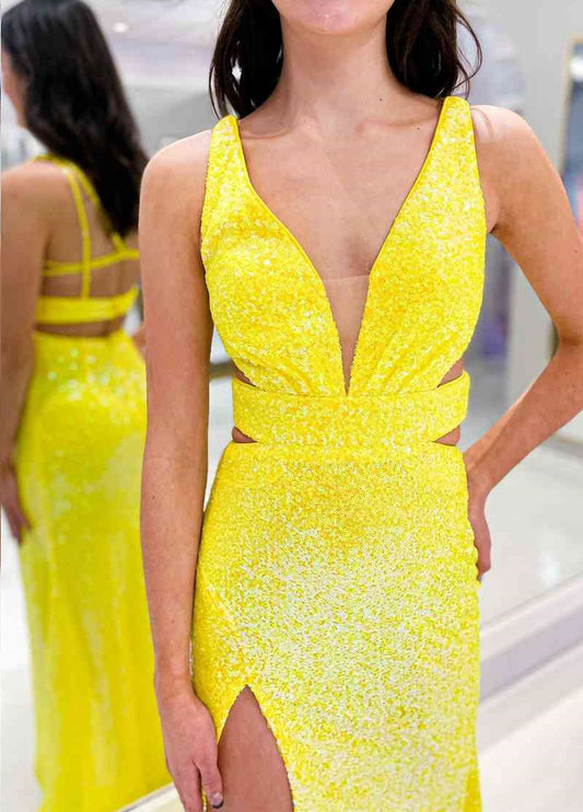 Sweep/Brush Train Dresses Cutout Yellow Shine Sparking Sequins V-Neck Long Prom Dress with Slit