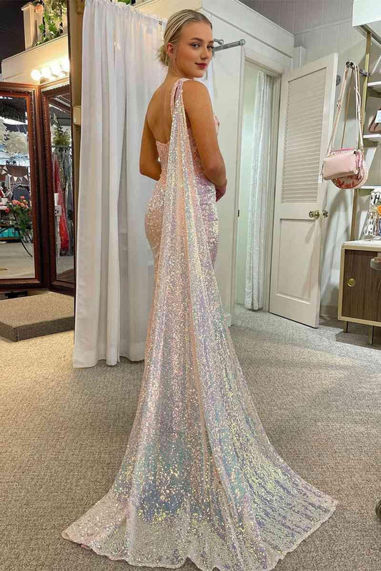 Sweep/Brush Train Dresses One-Shoulder Long Formal Dress with Shoulder Cape Sequins Prom Dress